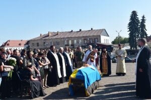 На майдані Незалежності міста Дубно поминальну панахиду відслужили священники Дубенського благочиння Православної Церкви України. Провести Героя в останню дорогу та підтримати згорьовану родину прийшли представники влади, військові побратими, а також чимало дубенчан.