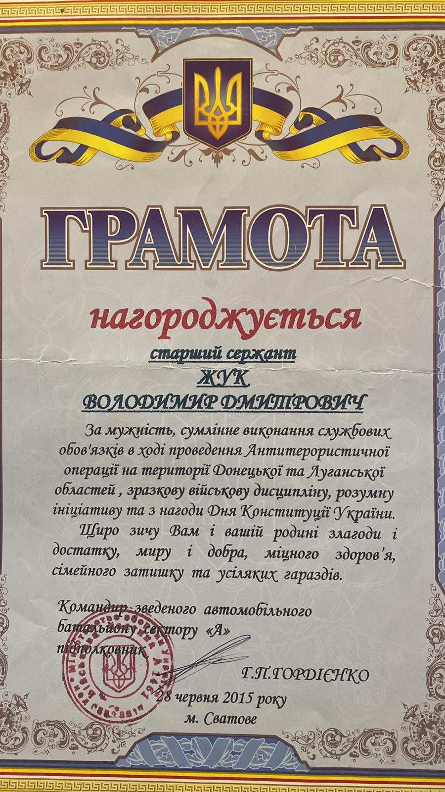 6 травня 2015 року старшого сержанта Жука Володимира Дмитровича, водія-гранатометника роти матеріального забезпечення, направили для проходження служби в місто Сватове Луганської області в сектор А.