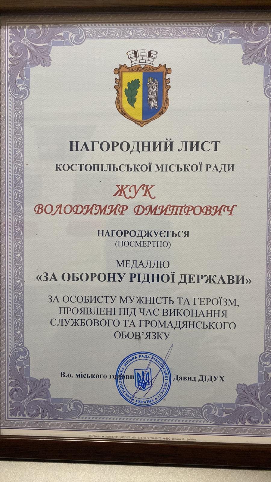 За особисту мужність та героїзм проявлені під час виконання службового та громадянського обовязку Володимир Жук нагороджений медаллю “За оборону рідної держави” (посмертно)